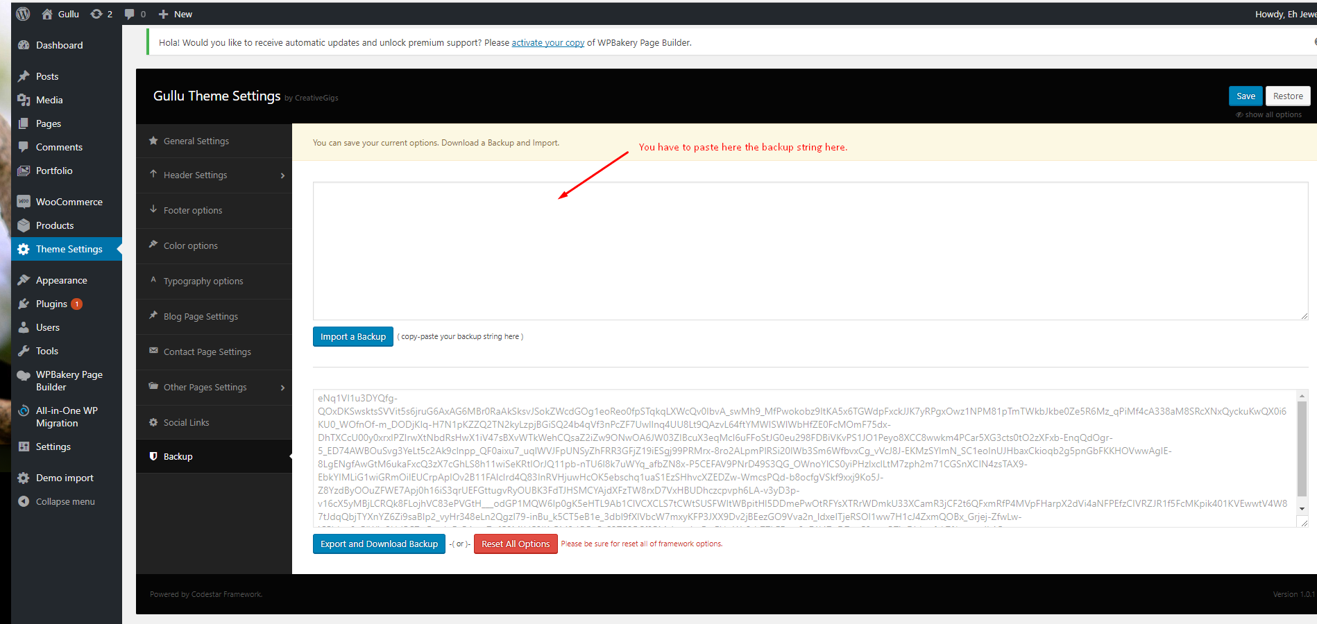 • Now you have to import the Dental Options as like the demo. Navigate to ‘Theme Settings > Backup’. Then copy-paste the backup string here and click on the Import a Backup button. You will find the backup string in the options.txt file.