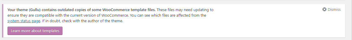 Your theme (Gullu) contains outdated copies Estimated reading: 1 minute 555 views This message appears when WooCommerce plugin changes any of its core files. Usually, this happens when WooCommerce publishes a major update or any minor update after the major update. (Example. 3.3, 3.3.1) We recommend clients to always read the changelog of your theme if the latest update of the theme supports that version of WooCommerce as noted in the plugin itself throughout the theme. If you recently updated WooCommerce, you might have spotted a notice like this on your Plugins page. If you see that the latest version of the theme doesn’t support the released WooCommerce version then please wait until we release a theme update that will support the latest version of this plugin. If you accidentally updated the plugin then don’t worry, we probably are working on the update and when the theme update is ready you will be notified by email if you have already enabled.